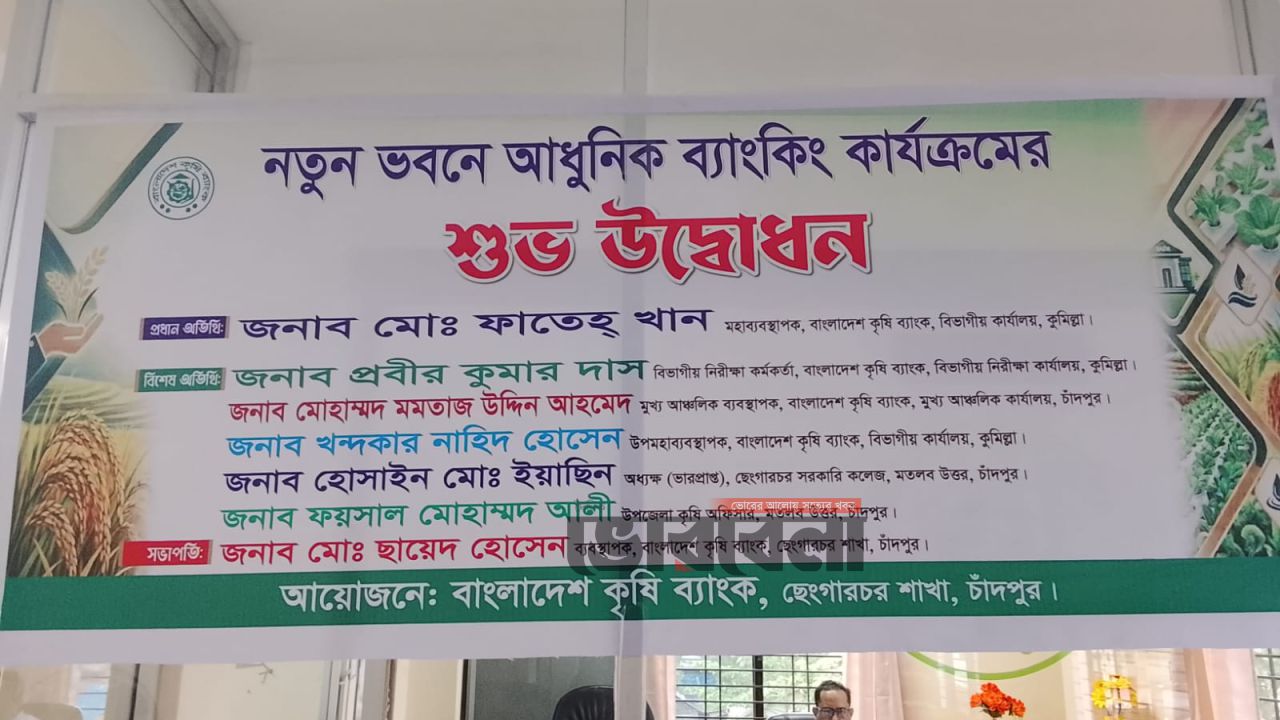 চাঁদপুরের মতলব উত্তর উপজেলার ছেঙ্গারচর বাজারে বাংলাদেশ কৃষি ব্যাংক-এর নতুন শাখার শুভ উদ্বোধন অনুষ্ঠিত হয়েছে। স্থানীয় কৃষক, ব্যবসায়ী ও সর্বস্তরের মানুষের ব্যাংকিং সেবা সহজলভ্য করতে এই শাখা চালু করা হয়েছে।